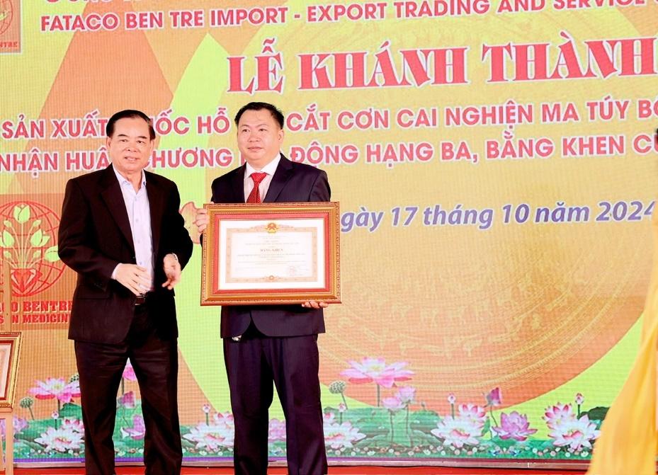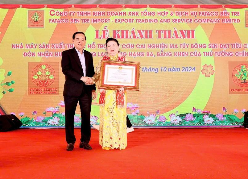BẾN TRE - Sáng ngày 17/10/2024, Công ty TNHH Kinh doanh XNK Tổng hợp và Dịch vụ Fataco Bến Tre (Công ty Fataco Bến Tre) đã tổ chức lễ khánh thành Nhà máy sản xuất thuốc hỗ trợ cắt cơn cai nghiện ma túy ''Bông Sen'' và đón nhận Huân chương Lao động hạng ba, nhận Bằng khen cao quý của Thủ tướng Chính phủ.